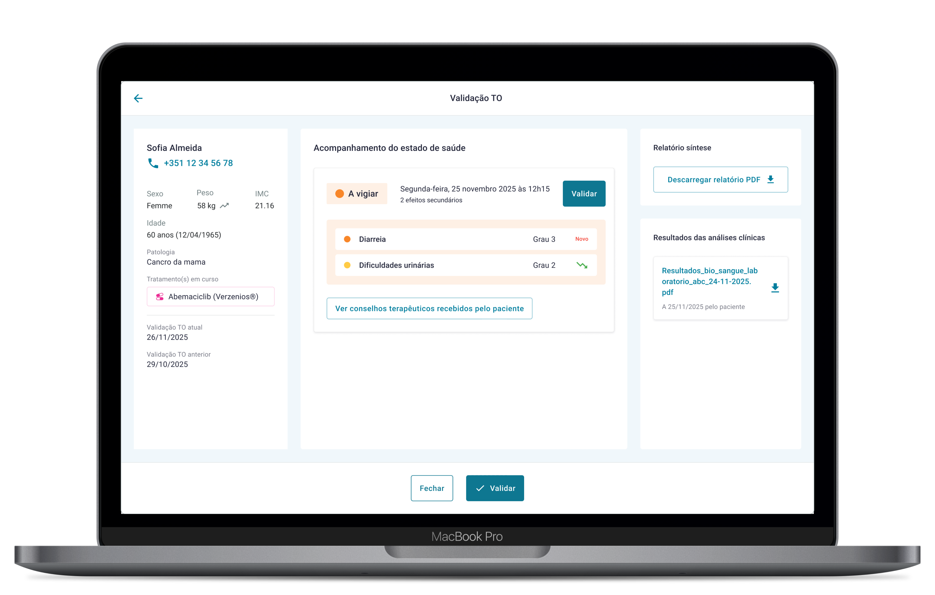 Após a análise das respostas pelo nosso dispositivo médico, é gerado um alerta para a equipa clínica que acompanha o paciente, e este recebe uma mensagem de orientação adequada ao seu estado de saúde e ao que reportou, incluindo conselhos terapêuticos para ajudá-lo(a) a gerir eventos adversos de grau 1 e 2.